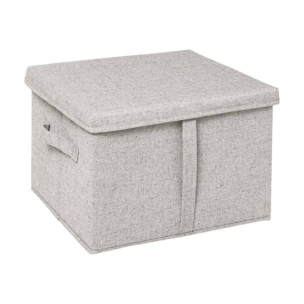 De stoffen opbergdozen hebben een kartonnen binnenzijde en een stoffen katoenen bekleding. De kleur is beige/grijs wat een luxe uitstraling geeft. De stoffen opbergdoos met deksel en handvatten aan zowel de voorzijde als de weerszijden, kan ingeklapt worden zodra er geen gebruik van wordt gemaakt. Er zijn verschillende afmetingen verkrijgbaar: