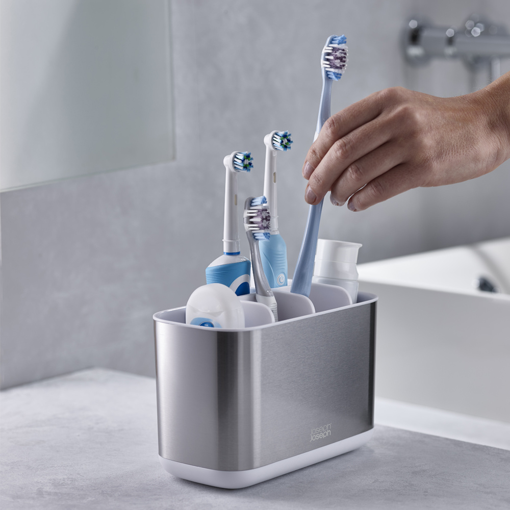 Naast je handtandenborstel passen ook elektrische tandenborstels en andere badkameraccessoires in de opberger. Zet het tandenborstel bakje neer op je wastafel of zet hem uit het zicht in een van je badkamerkastjes. De houder is makkelijk uit elkaar te halen zodat het bakje goed schoongemaakt kan worden. Ook is er een ventilatiegat aanwezig waardoor de houder snel opdroogt als er waterresten van de tandenborstels afkomen. Vanaf nu kunnen je badkameraccessoires schoon en gestructureerd opgeborgen worden! Maak je set compleet met andere badkamer opbergers uit de EasyStore collectie van Joseph Joseph.