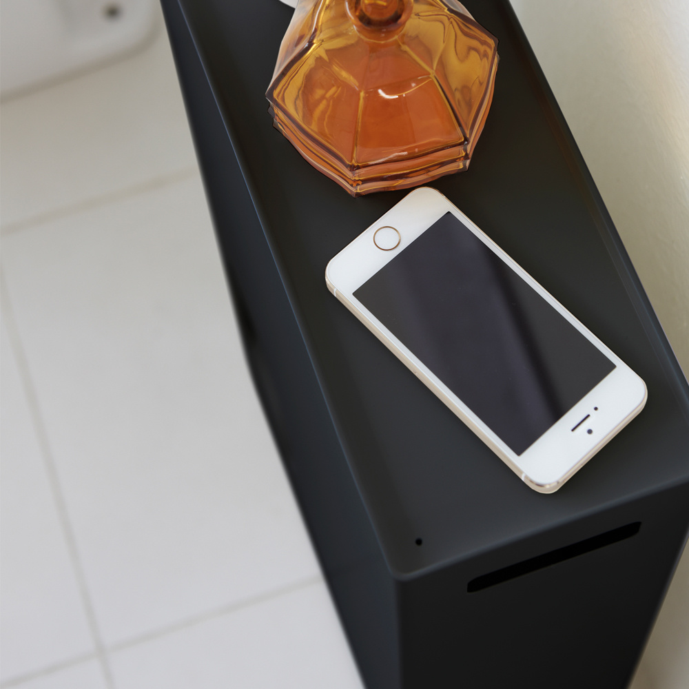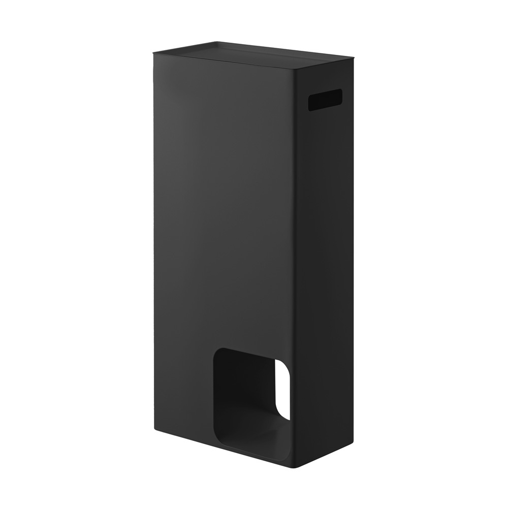 De toiletrollenhouder is gemaakt van metaal en heeft een prachtige matzwarte afwerking wat zorgt voor een luxe uitstraling in je toilet. Het wc rol kastje heeft een deksel en handvatten aan beide kanten. Door het deksel kun je de toiletrollen eenvoudig opbergen en navullen, maar tegelijkertijd fungeert het ook als plateau voor decoratie. In totaal is de toiletrolhouder 23 cm breed, 12,5 cm diep en 48 cm hoog.