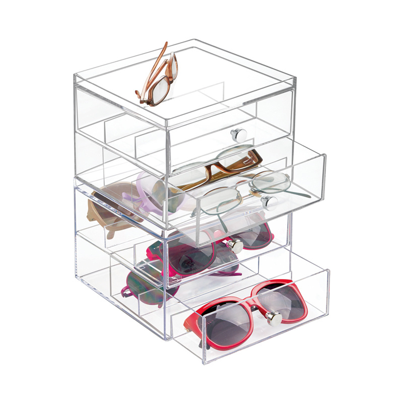 De transparante opbergdoos is gemaakt van acryl kunststof en de handgrepen op de lades hebben een verchroomde afwerking. Alle modellen zijn 16,5 cm diep en 16,5 cm breed. Als je het schoon wilt maken doe je dit met een doekje en een beetje zeep.