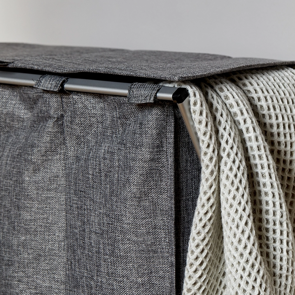Een ander handig kenmerk van deze wasmand is het slimme deksel. Hiermee kun je het vuile wasgoed uit het zicht houden en je badkamer of slaapkamer netjes en opgeruimd houden. De praktische draagriem maakt het gemakkelijk om de wasmand te dragen, zelfs als hij vol is. Het hoogwaardige aluminium frame van de trio wasmand is zowel stabiel als lichtgewicht. Het kan eenvoudig worden ingeklapt om ruimte te besparen wanneer je hem niet gebruikt. Zo kun je hem gemakkelijk opbergen als je hem even niet nodig hebt.