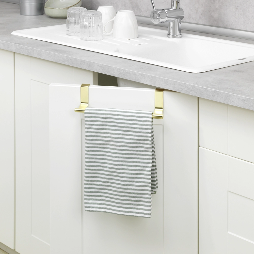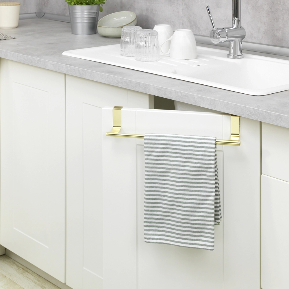 Dit handige rek kan eenvoudig aan het keukenkastje worden bevestigd zonder dat er geboord hoeft te worden. Hang je thee- of handdoeken op aan dit stijlvolle rek en houd je keuken georganiseerd en netjes. Gemaakt van hoogwaardig roestvrij staal, zorgt dit handdoekrek voor langdurig gebruik zonder roestvorming. De rubberen pads voorkomen krassen op je kastdeurtjes, wat zorgt voor een zorgeloze installatie. Het trendy gouden design past perfect in zowel moderne als landelijke keukens, waardoor het een veelzijdige keuze is voor elke inrichting. Uitschuifbaar van 22 tot 35 cm, met een diepte van 6,5 cm en een hoogte van 5,5 cm. Hierdoor past het rek in vrijwel elke keuken.