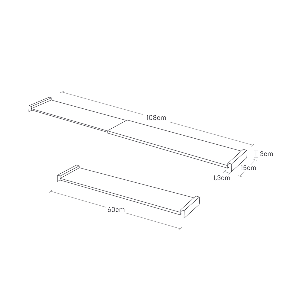 - De plank is uitschuifbaar waardoor deze in alle lades van 60 tot 108 cm breed past