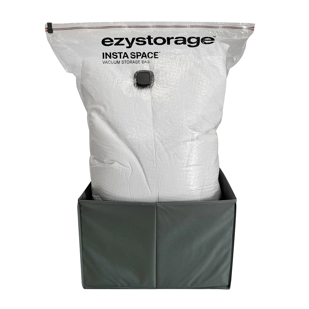 Met het exclusieve klepsysteem van Insta Space wordt het comprimeren van textiel een fluitje van een cent, waardoor je tot wel 60% ruimte bespaart in je kast of onder het bed. Je zet heel eenvoudig de stofzuiger op het ventiel, en binnen luttele seconden wordt alle lucht uit de vacuümzak gezogen totdat een klein pakketje overblijft. Deze vacuumzakken zijn niet alleen een uitkomst voor het opbergen, maar ook voor het waarborgen van de conditie van je spullen. Ze bieden een ondoordringbare barrière tegen schimmel, water, vuil, insecten en onaangename geurtjes. De dubbele zip-sluiting verzekert dat eens verzegeld, je textiel zo goed als nieuw blijft. De vacuumzakken met hoes hebben een fabrieksgarantie van maarliefst 5 jaar en zijn beschikbaar in de volgende formaten: