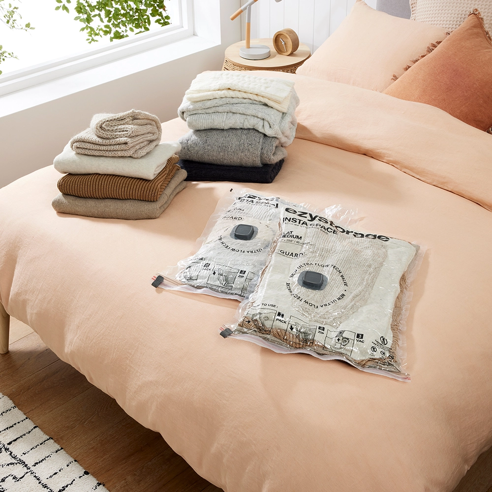 De vacuümzakken zijn specifiek ontworpen om je essentiële huishoudelijke items te beschermen en netjes weg te bergen. Of het nu gaat om linnen beddengoed, donzige dekbedden, pluizige kussens, kledingstukken, kleedjes of handdoeken; onze vacuümzakken maken het opbergen van beddengoed een fluitje van een cent. Stop het op te bergen product erin, sluit de vacuümzak af met de dubbele zip-sluiting, zet heel eenvoudig de stofzuiger op het ventiel, en binnen luttele seconden wordt alle lucht uit de vacuümzak gezogen totdat een klein pakketje overblijft. Met deze zakken uit de Insta Space collectie creëer je direct meer ruimte in je huis. Beschikbaar in 4 formaten: