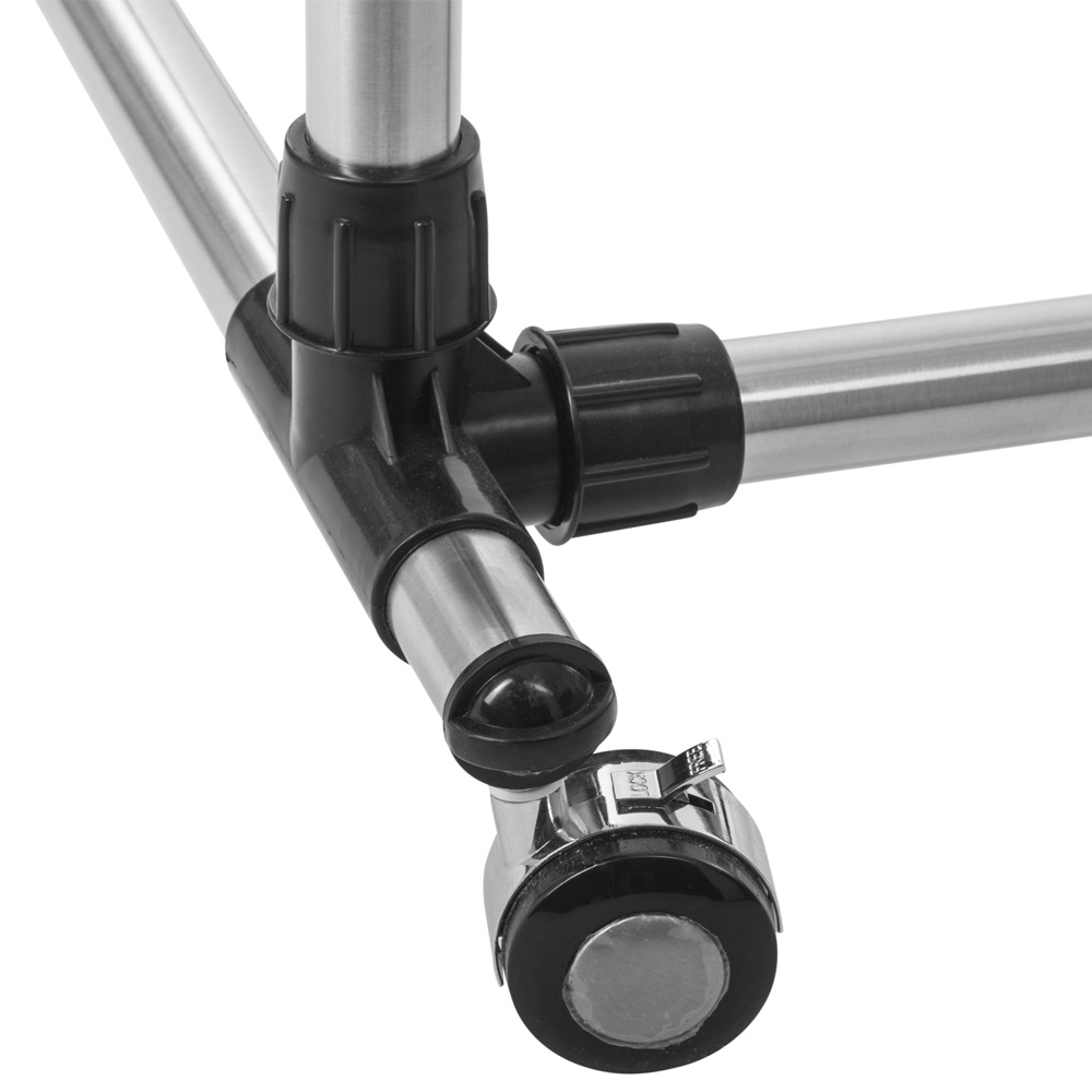 Dit verrijdbaar kledingrek is gemaakt van roestvrijstaal (RVS) en heeft kunststof koppelstukken in een zwarte kleur. Het kledingrek op wielen heeft een rem zodat het netjes op z’n plek blijft staan. De twee stangen zijn verstelbaar: in de hoogte van 97 tot 163 cm en in de breedte van 87 tot 149 cm. In totaal is het kledingrek 150 cm breed, 66 cm diep en 165 cm hoog.