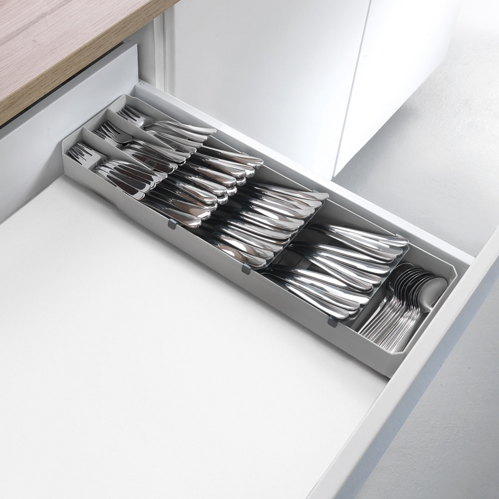 Deze verstelbare bestekbak is ideaal voor iedere keukenlade. Pas de lengte van de bak aan en maak met de verdeelstukken jouw perfecte indeling. Door het bestek schuin boven elkaar te stapelen bespaar je veel ruimte in de keukenlade.