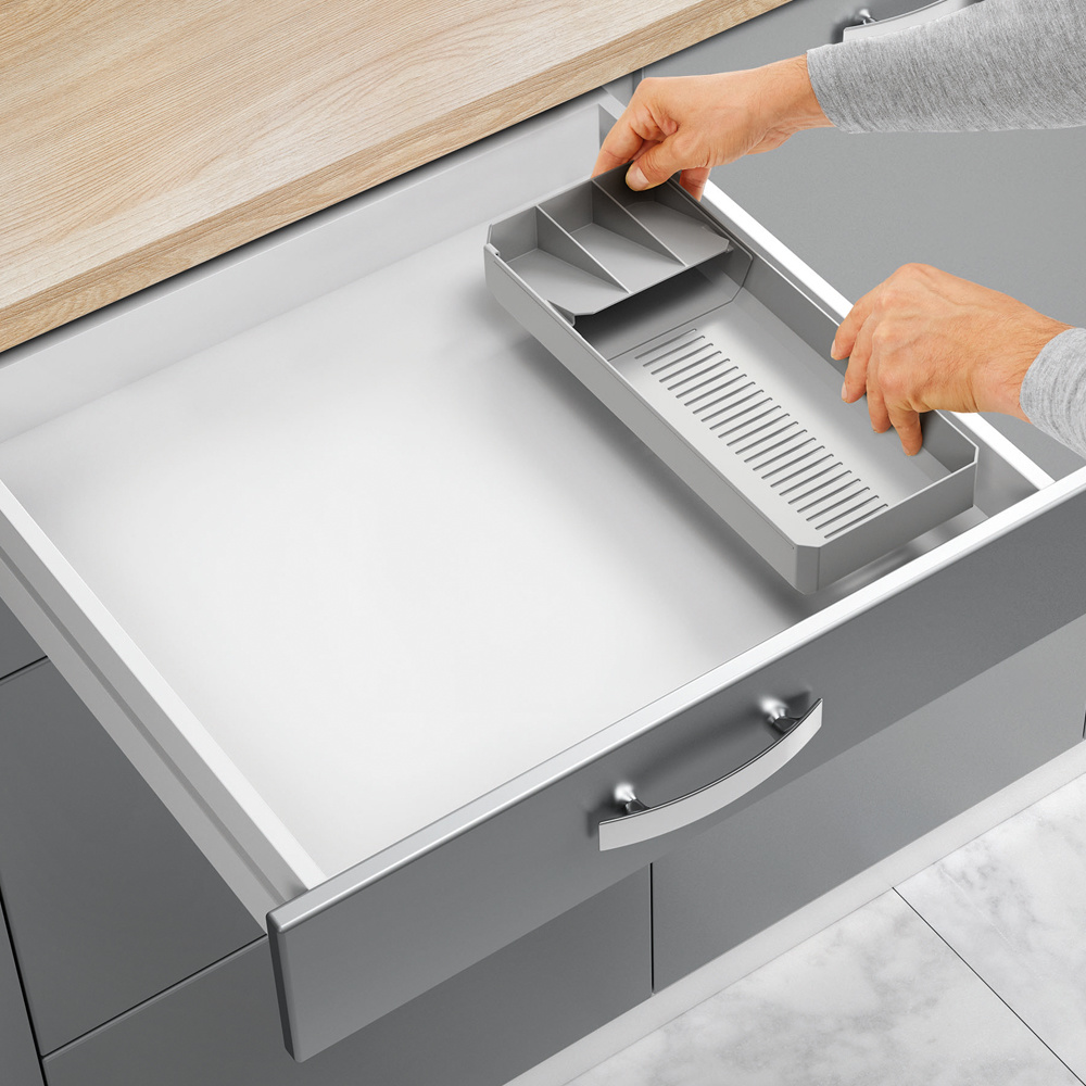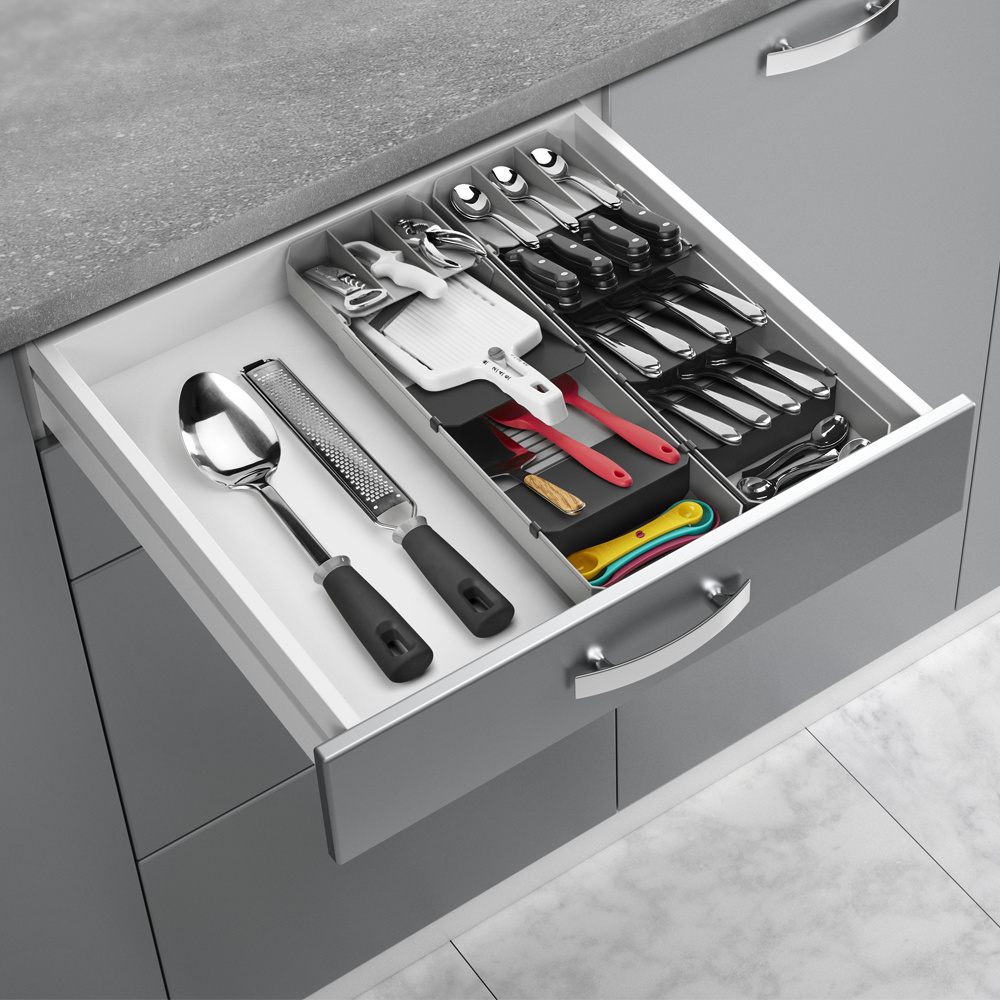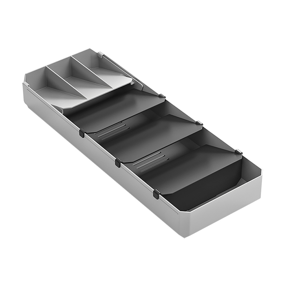 Deze uitschuifbare bestekbak is in lengte uit te schuiven tot maximaal 49 cm en is helemaal ingeklapt 40 cm. De overige afmetingen zijn 15 cm breed en 6 cm hoog, waardoor deze perfect in elke lade moet passen. Er passen maximaal 90 bestekonderdelen in de verstelbare bestekbak en deze is gemaakt van grijs kunststof. De verdeelstukken zijn uitneembaar waardoor je een eigen indeling en grootte van de vakken kunt bepalen. De organizer heeft 3 jaar fabrieksgarantie.