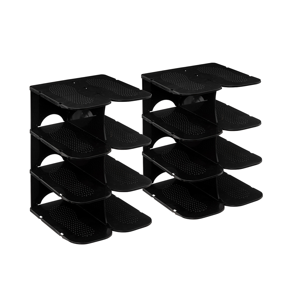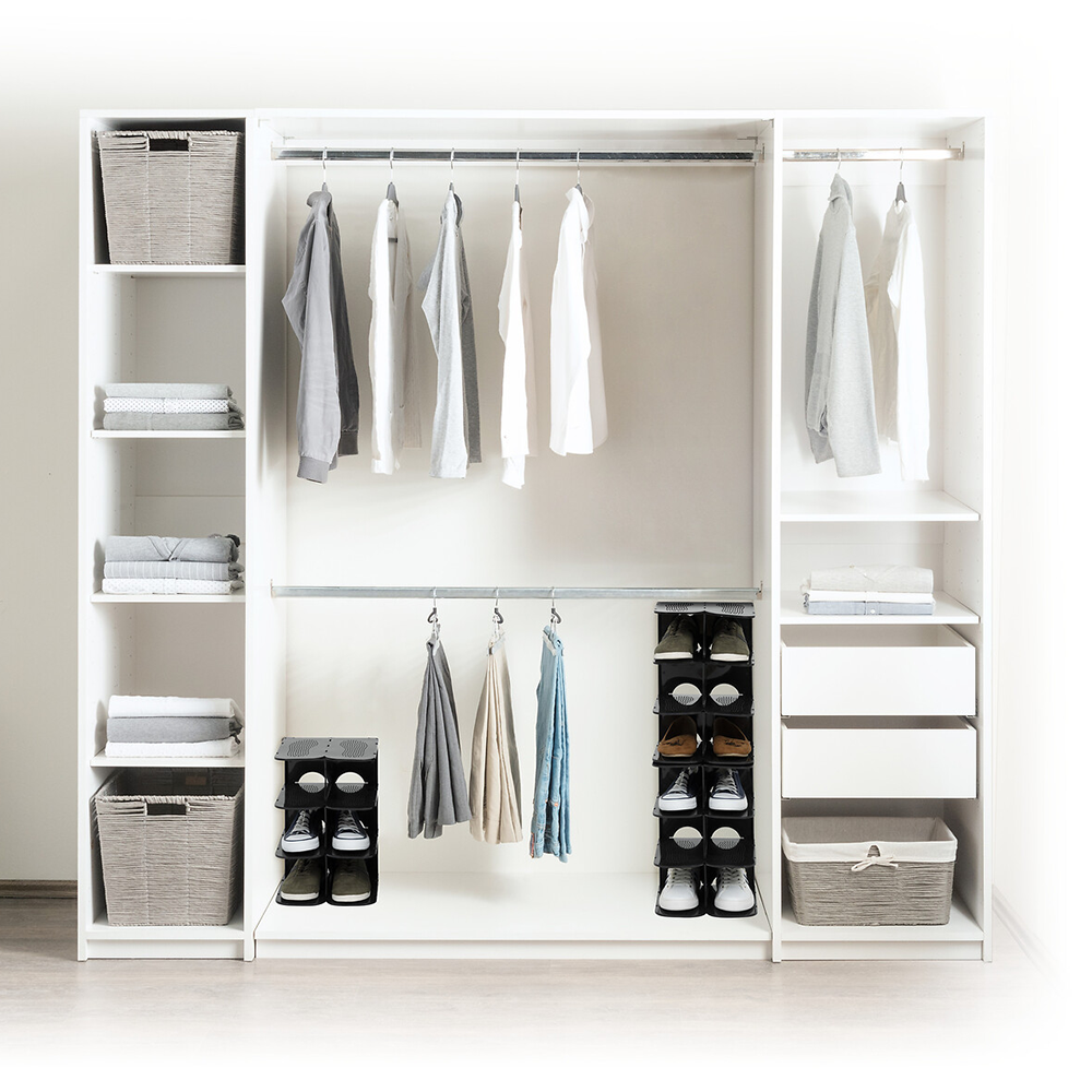 Het verticaal schoenenrek is modulair en stapelbaar, wat betekent dat je zelf kunt kiezen hoe hoog je het rek maakt. Je kunt het rek aanpassen voor 2, 3 of 4 paar schoenen of zelfs een extra rek bovenop zetten voor nog meer opbergruimte. Elk component is per stuk afneembaar, zodat je de hoogte eenvoudig kunt aanpassen aan je behoeften. Of je nu een schoenenrek zoekt voor in de kledingkast of voor op de gang, dit rek biedt altijd een ruimtebesparende en nette oplossing.Het verticaal schoenenrek is de ideale keuze voor wie op zoek is naar een compacte en functionele manier om schoenen te stapelen en op te bergen. Met zijn eenvoudige montage, modulaire ontwerp en eenvoudige ontwerp voldoet dit rek zeker aan al je verwachtingen.