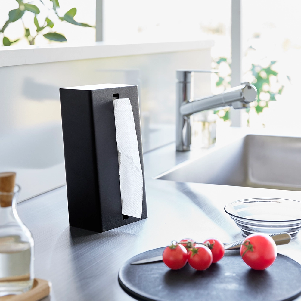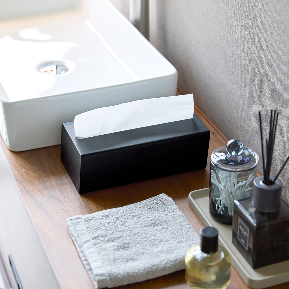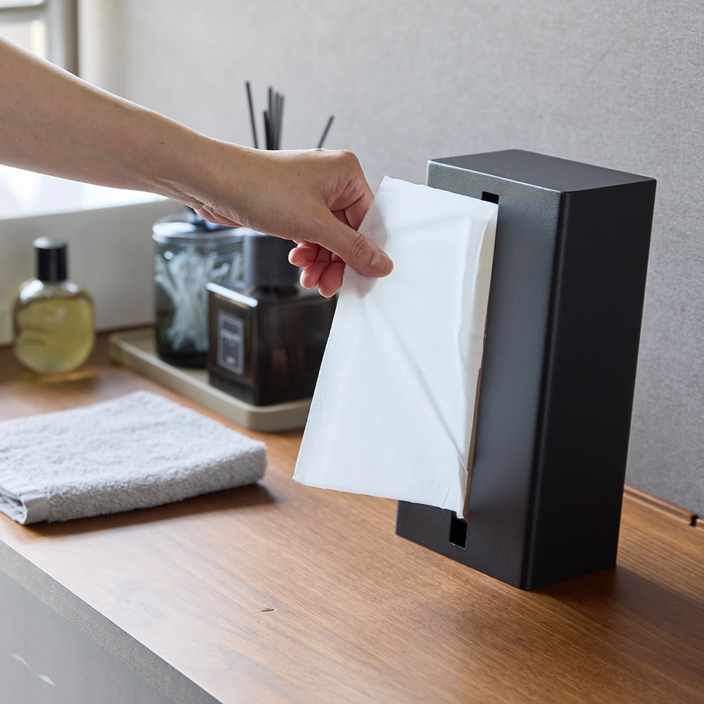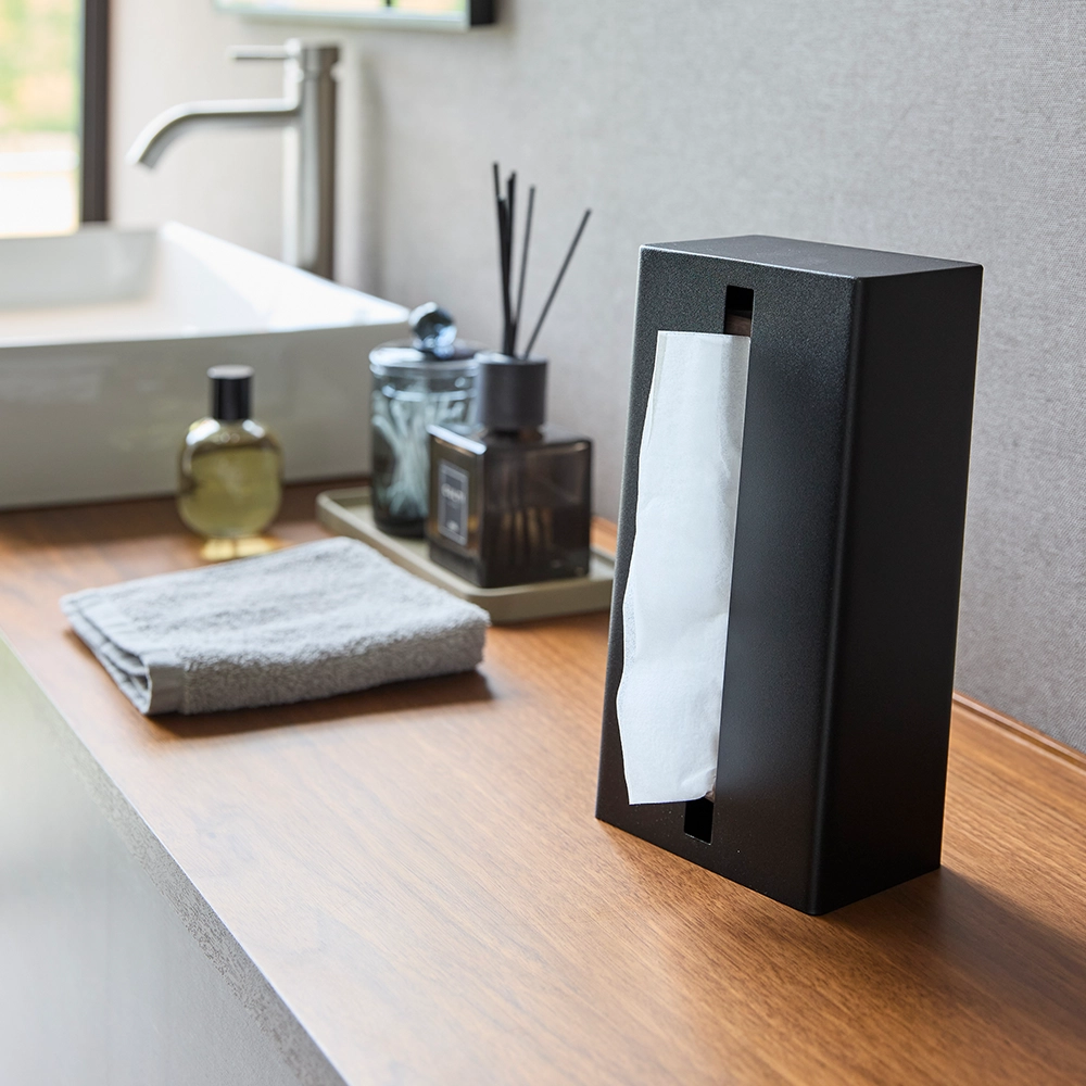De tissuebox van Yamazaki combineert een strak en modern design met praktische functionaliteit. Het verticale ontwerp bespaart ruimte en maakt deze tissuehouder ideaal voor gebruik in kleine ruimtes, zoals badkamers, slaapkamers of keukens.