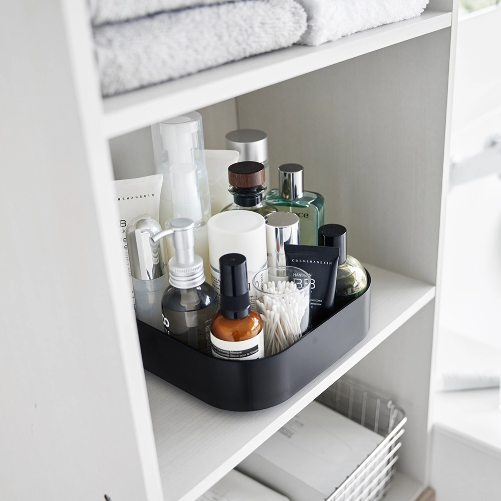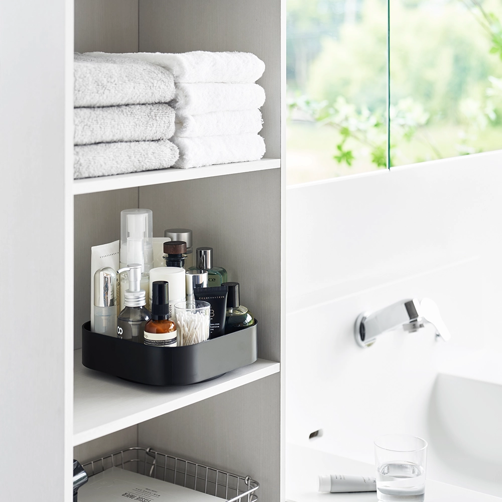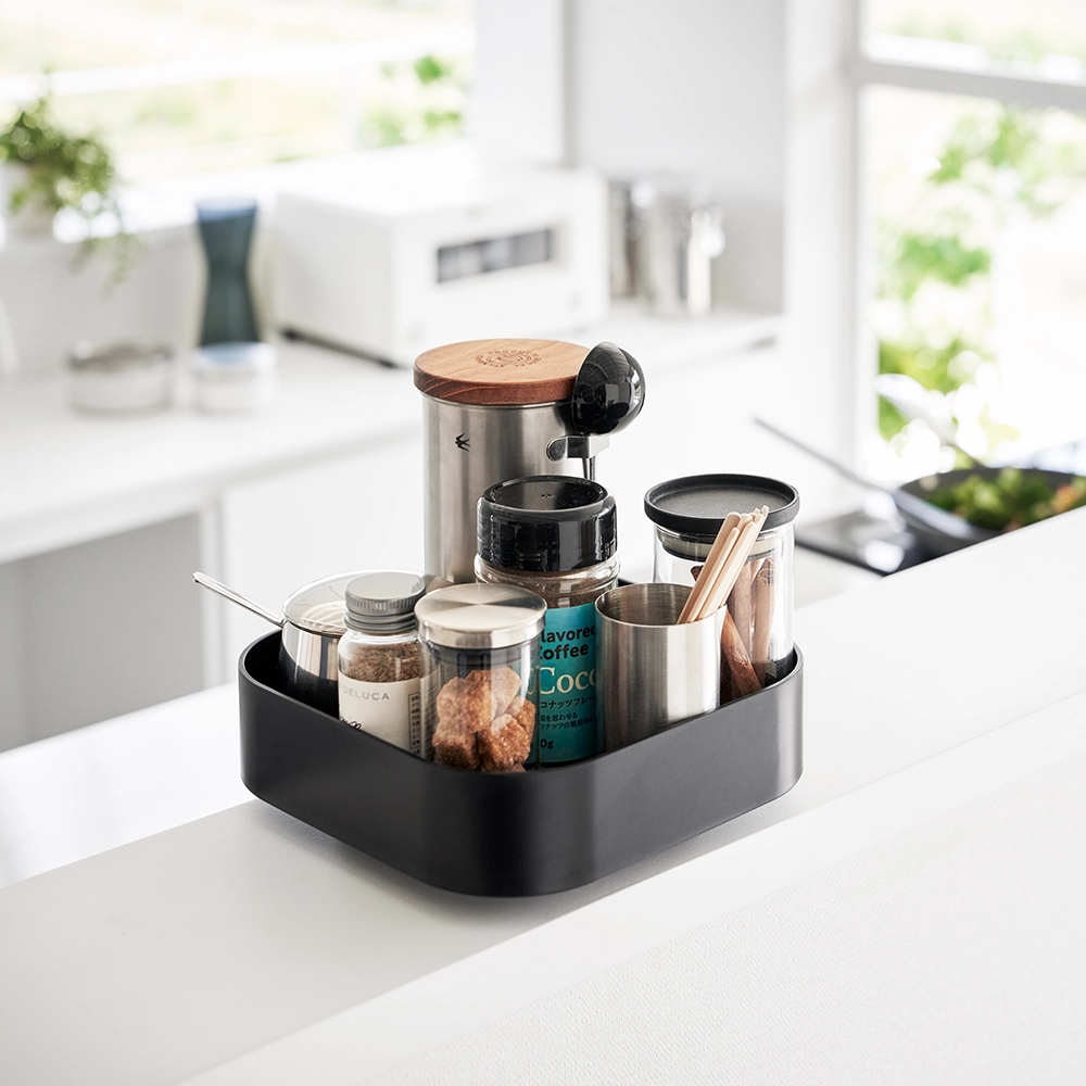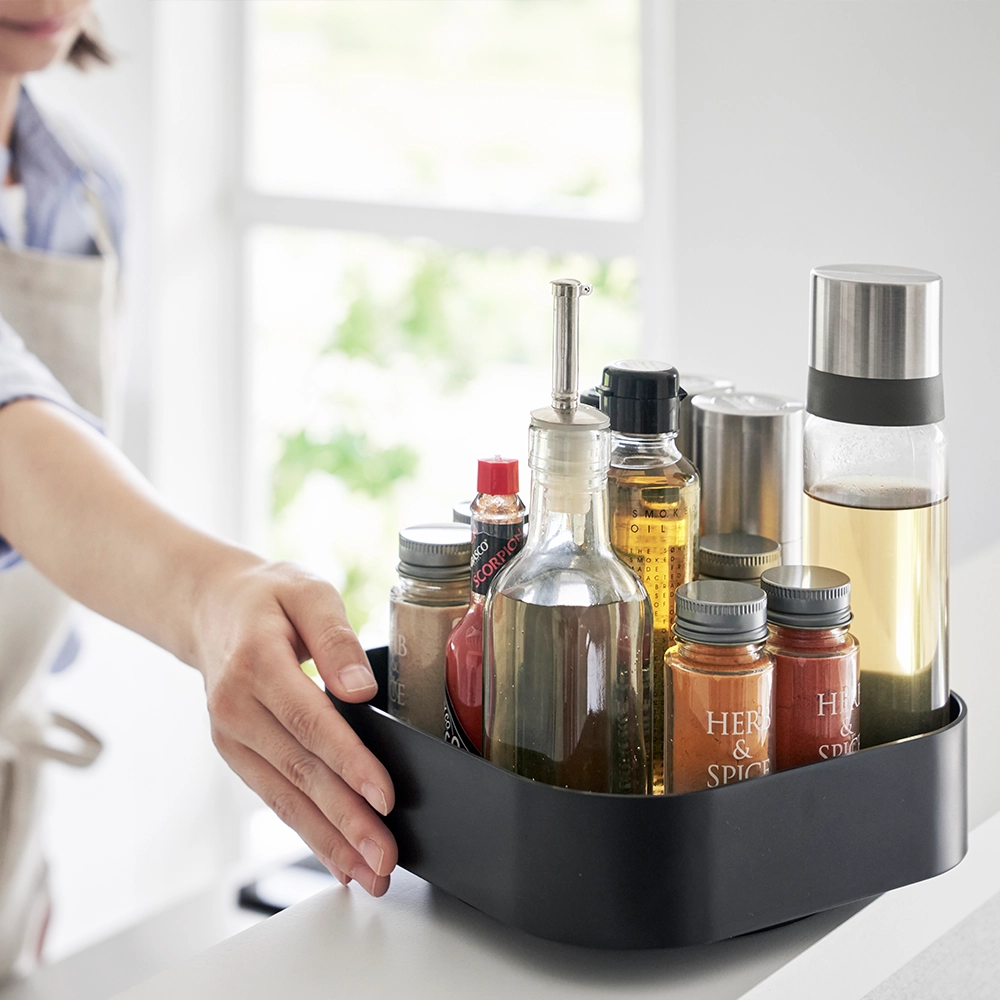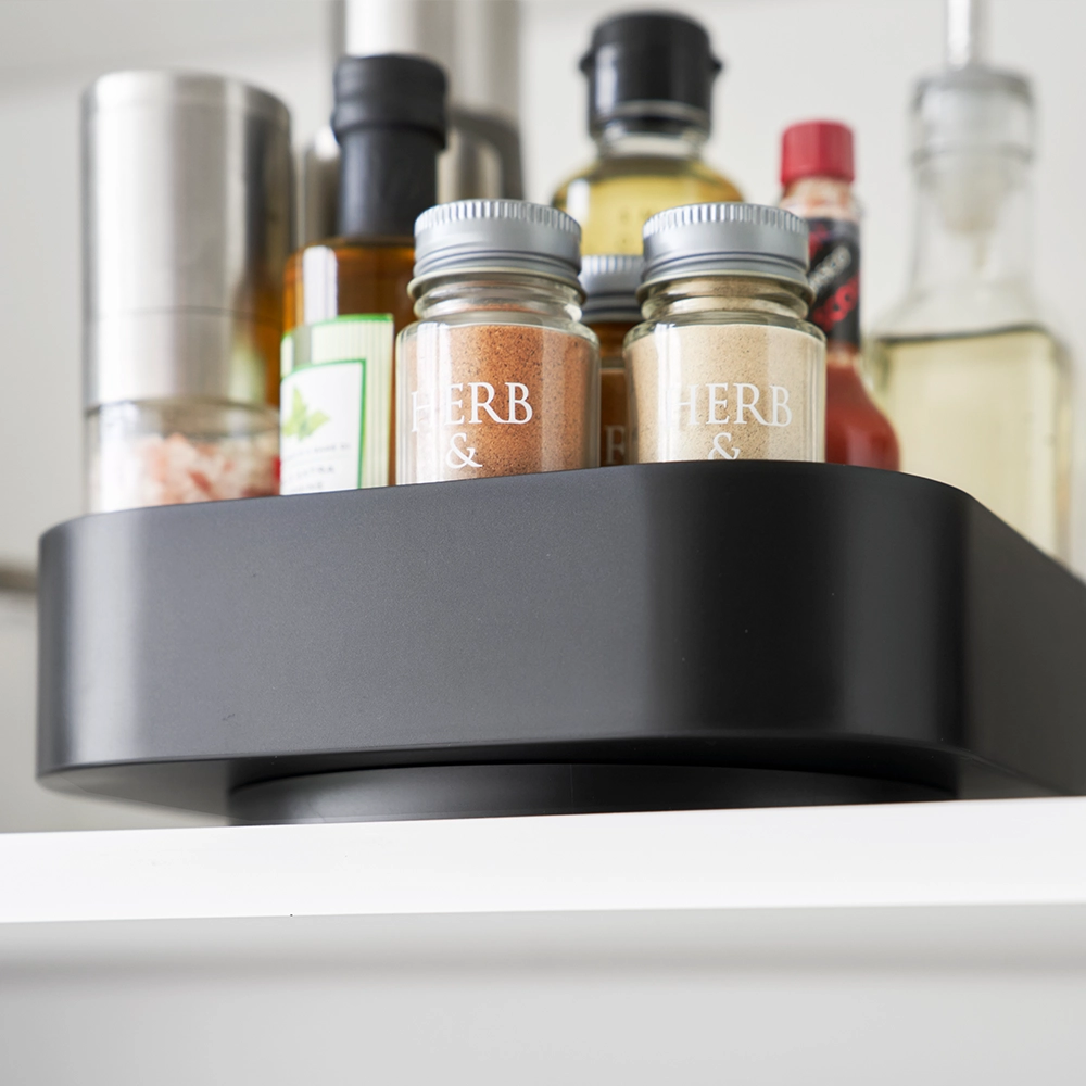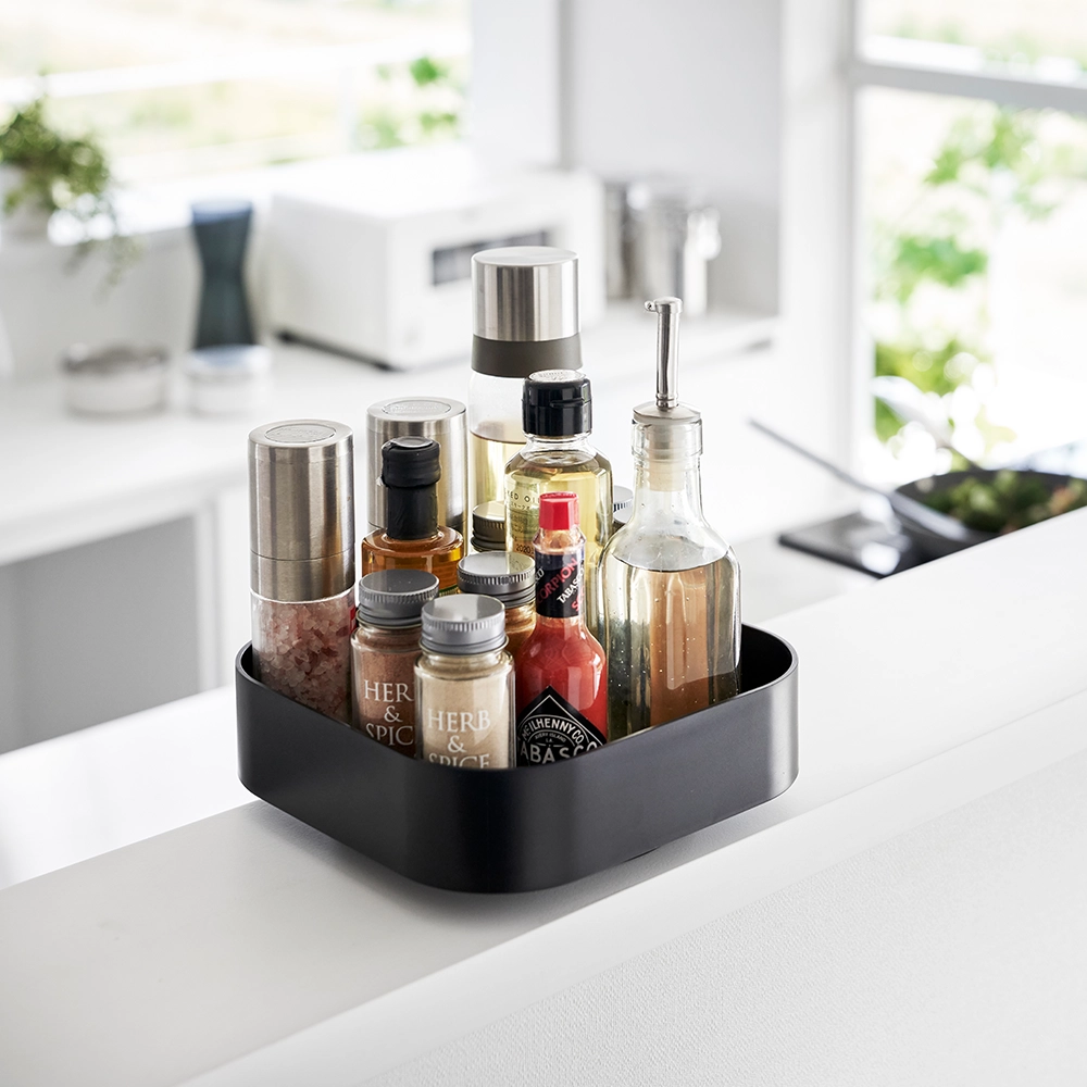 Het zwarte vierkante draaiplateau van Yamazaki is een slimme en elegante manier om verschillende huishoudelijke items georganiseerd en binnen handbereik te houden. Dit veelzijdige draaiplateau is perfect voor gebruik in de keukenkast, badkamer of elke andere ruimte waar je snel en gemakkelijk toegang wilt hebben tot je spullen.