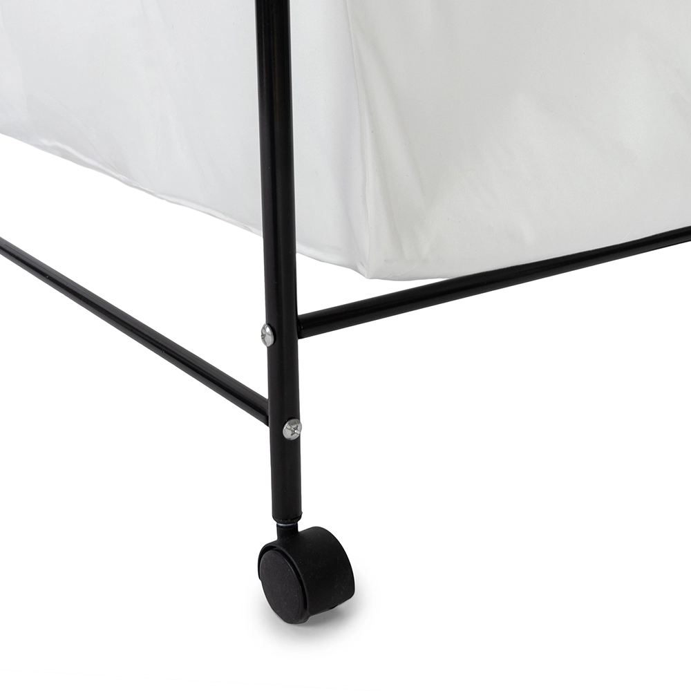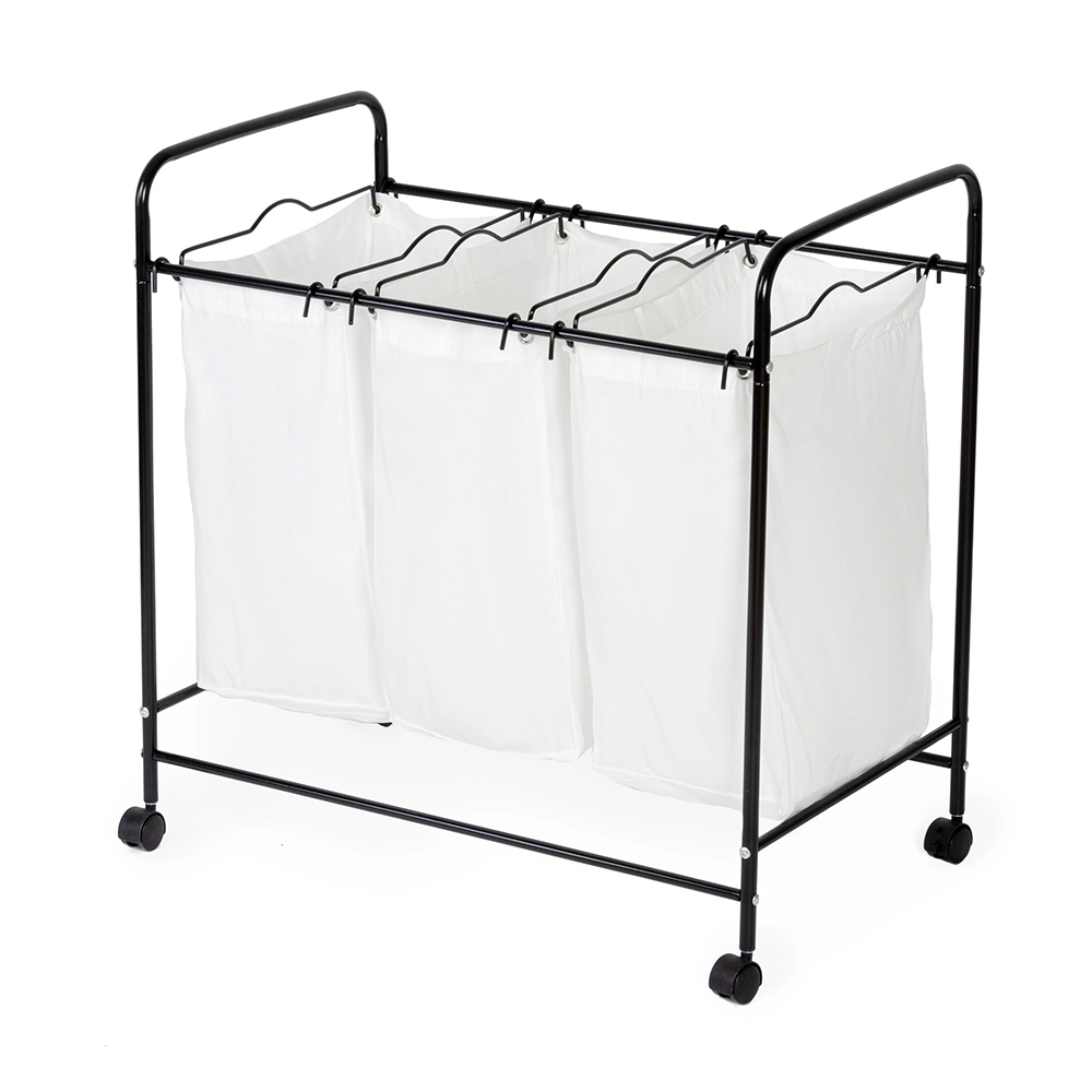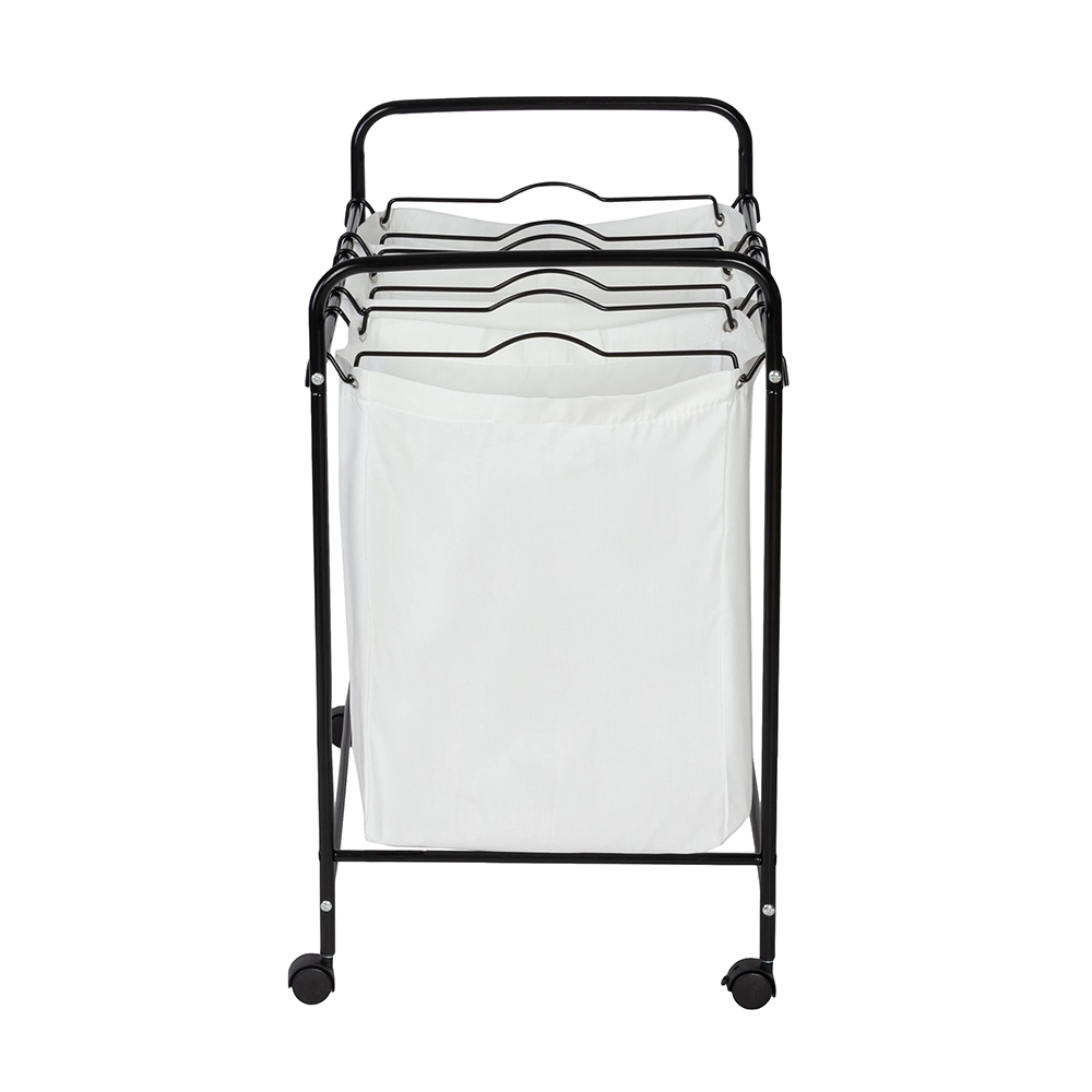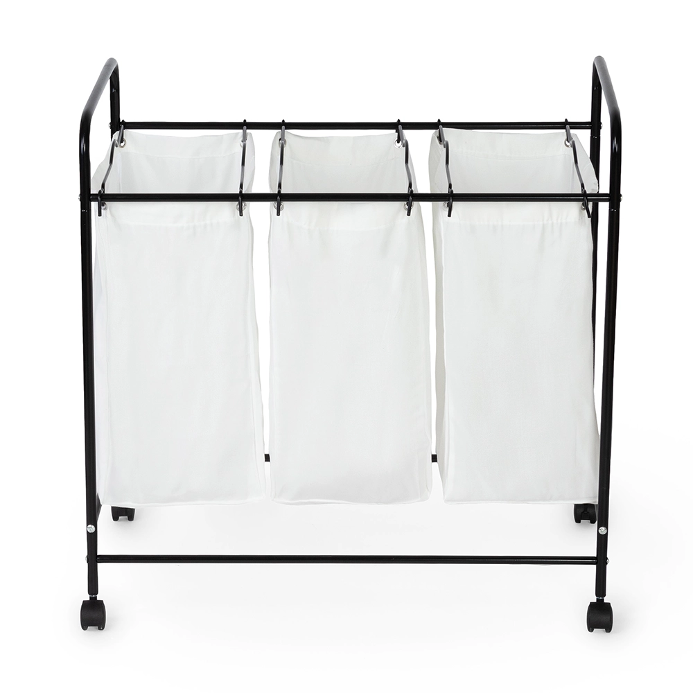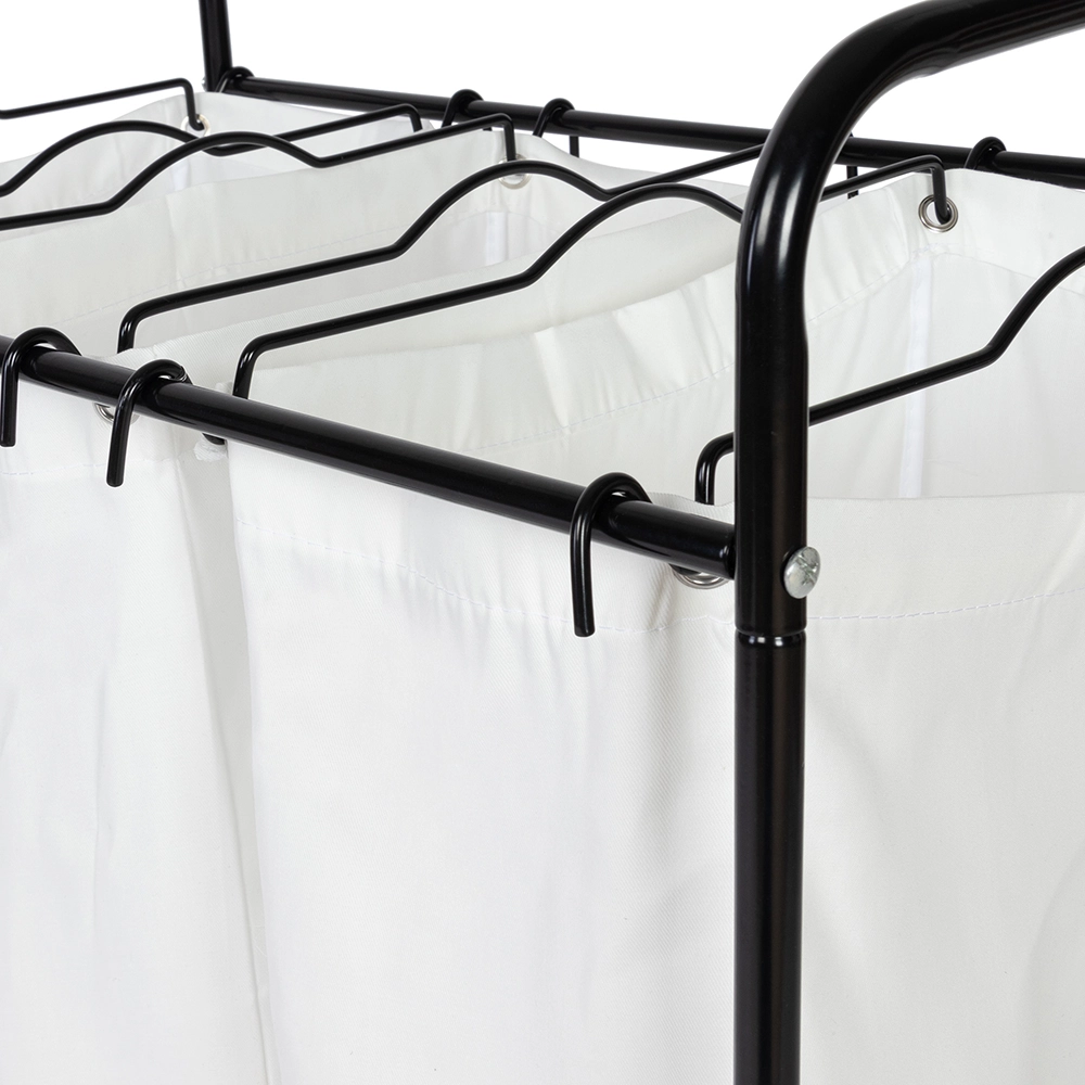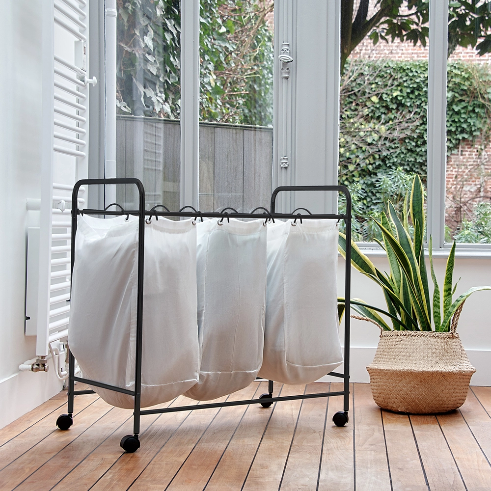Deze handige wasmand is uitgevoerd met drie afzonderlijke vakken, waardoor het voorbereiden van je was op kleur of materiaal een fluitje van een cent wordt. De zwarte gelakte metalen structuur met epoxyafwerking staat garant voor kwaliteit en geeft een moderne touch aan elke wasruimte. De witte waszakken van polykatoen zijn niet alleen praktisch, maar ook esthetisch aangenaam en passen in elke interieurinrichting.