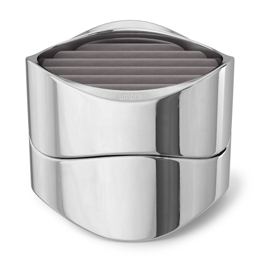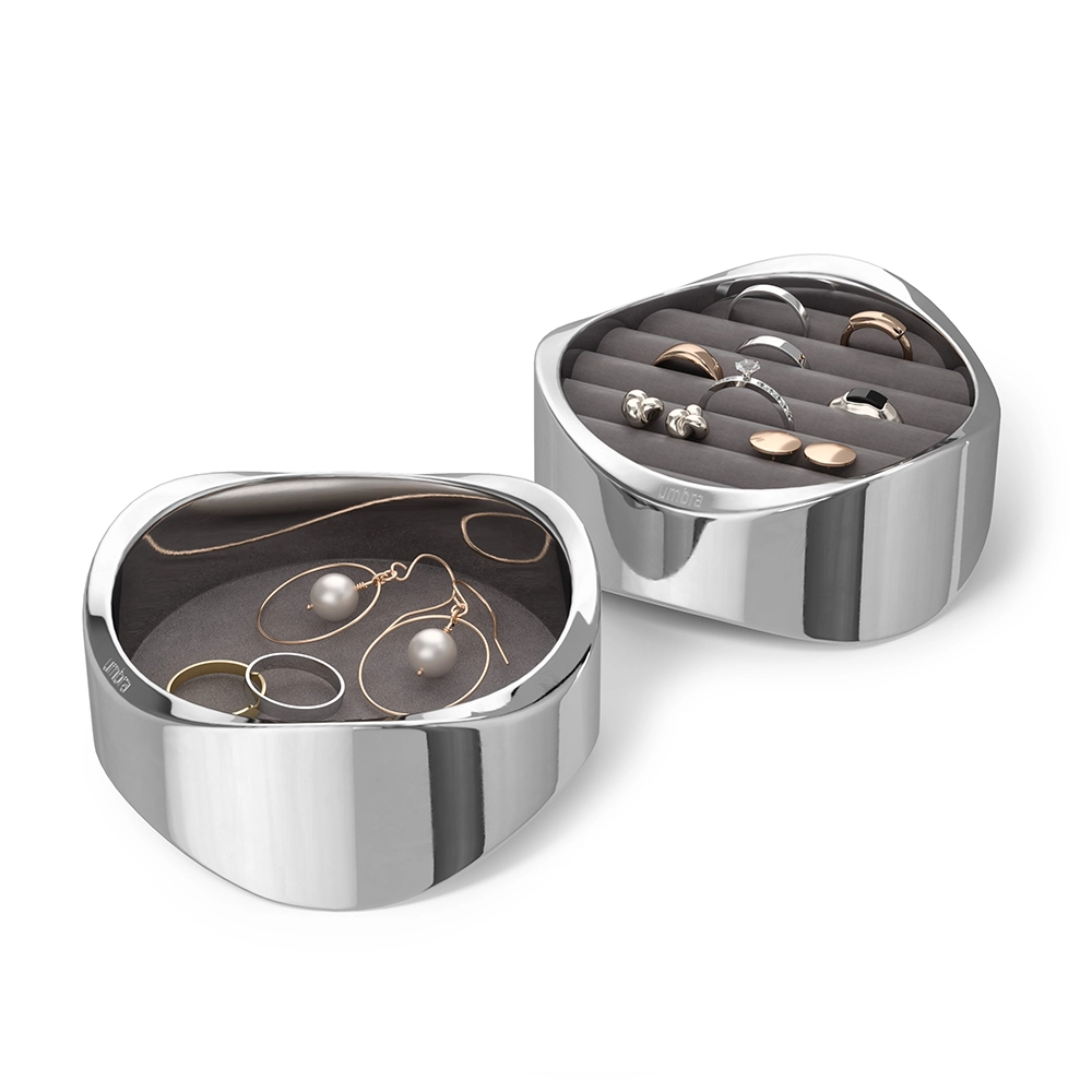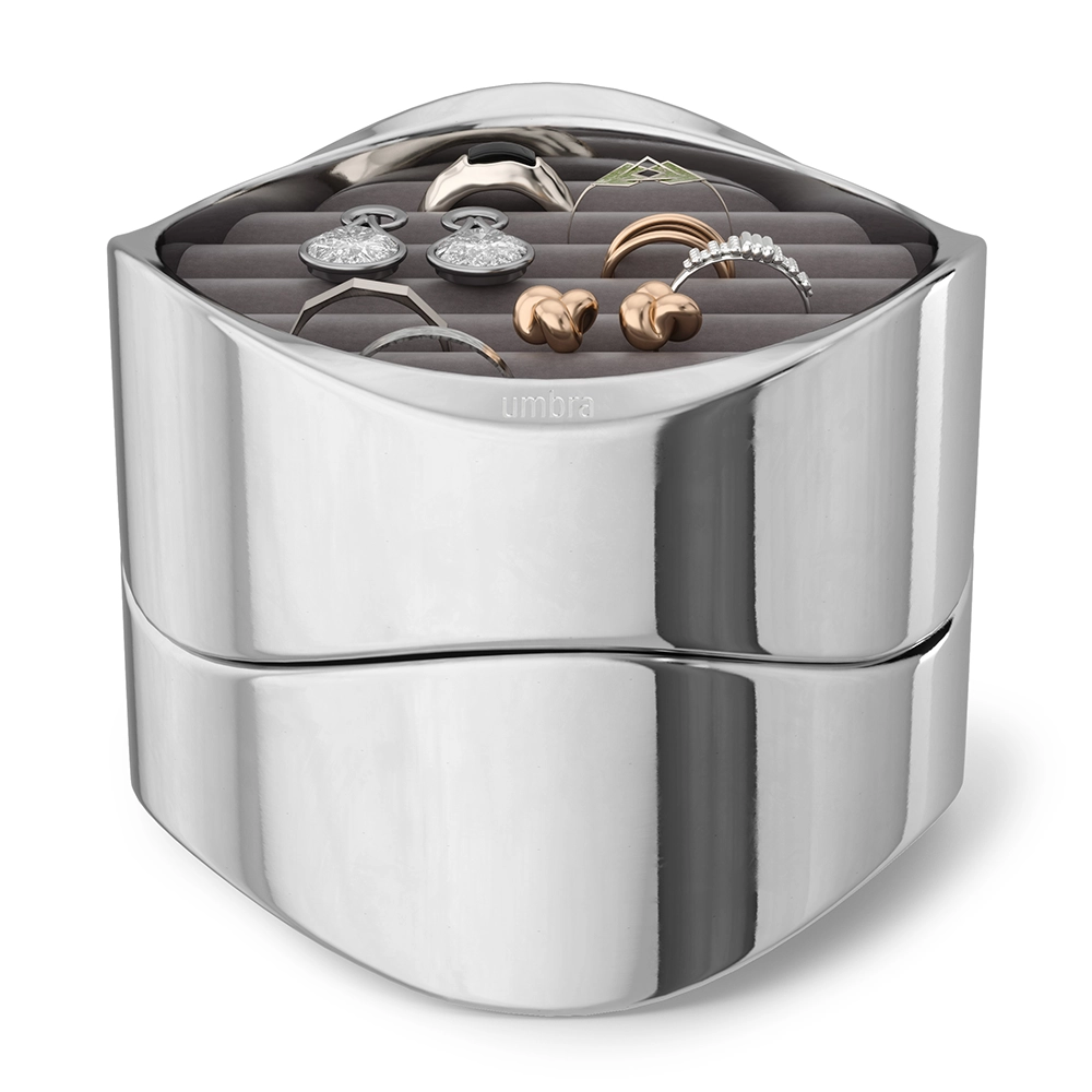 Het sieraden bakje van Umbra is ontworpen met oog voor detail en is perfect voor het netjes organiseren van al je sieraden. Dankzij de fluwelen voering blijven je accessoires krasvrij en glanzend, terwijl de stapelbare houders je de vrijheid geven om je sieraden op jouw manier te presenteren. Ideaal voor ringen, oorbellen, armbanden of horloges, en perfect als cadeau voor elke sieradenliefhebber.