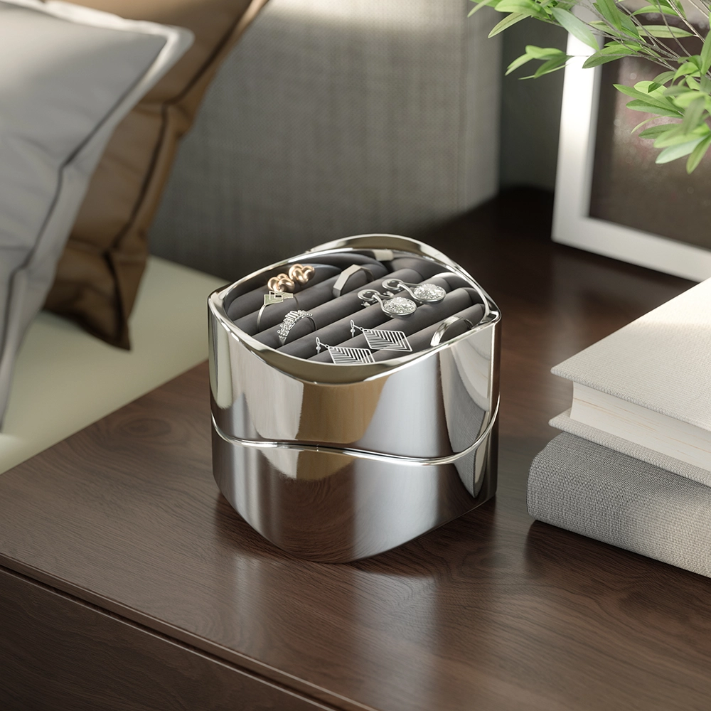 Dit sieraden bakje heeft een afwerking van glanzend gepolijst chroom en is gemaakt van 98% zink en 2% fluweel, wat zorgt voor een luxe uitstraling en langdurige duurzaamheid. De zachte, fluwelen voering beschermt je oorbellen, ringen, armbanden en accessoires tegen krassen en slijtage. Wavy bestaat uit twee afzonderlijke houders die je kunt stapelen voor een gelaagde look of apart kunt gebruiken, afhankelijk van je stijl en ruimte. Deze sieraden organizer is niet alleen functioneel, maar ook een prachtig decoratief element voor je slaapkamer, badkamer of kaptafel. Met een afmeting van 10 cm breed, 10 cm diep en 8 cm hoog, biedt Wavy voldoende ruimte voor al je favoriete sieraden.