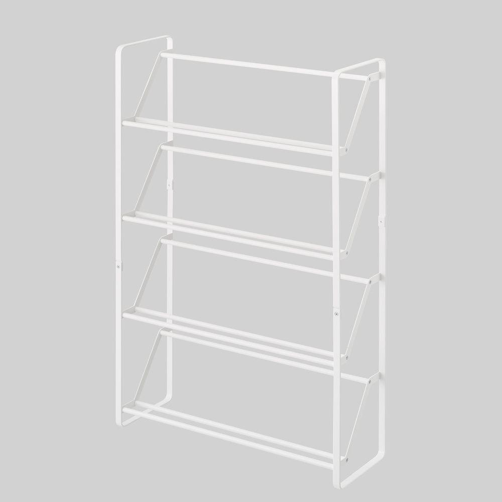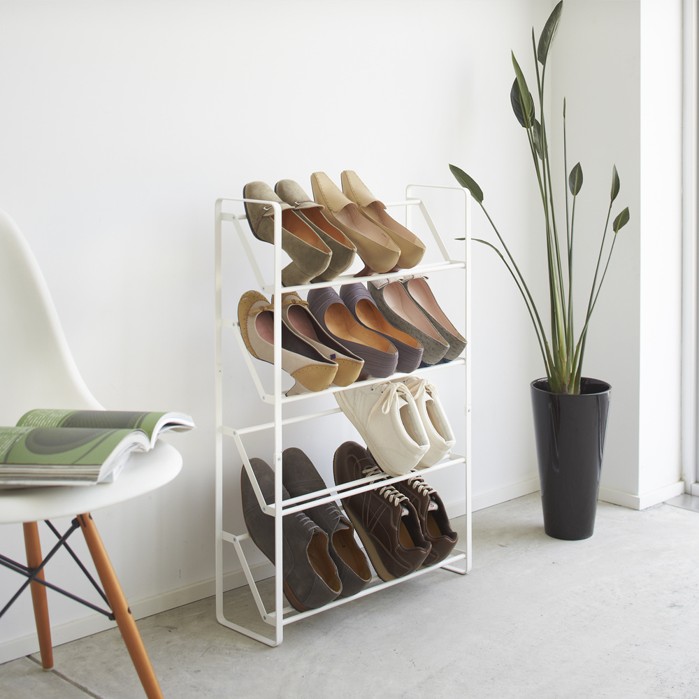 Door je schoenen schuin op te bergen, neemt de metalen schoenenkast van Yamazaki weinig ruimte in beslag. Met de vier niveaus van het rek kan iedereen in het gezin zijn of haar schoenen kwijt op de kast. Zet het rek bijvoorbeeld onder een kapstok of naast de deur voor een mooi opgeruimde hal.