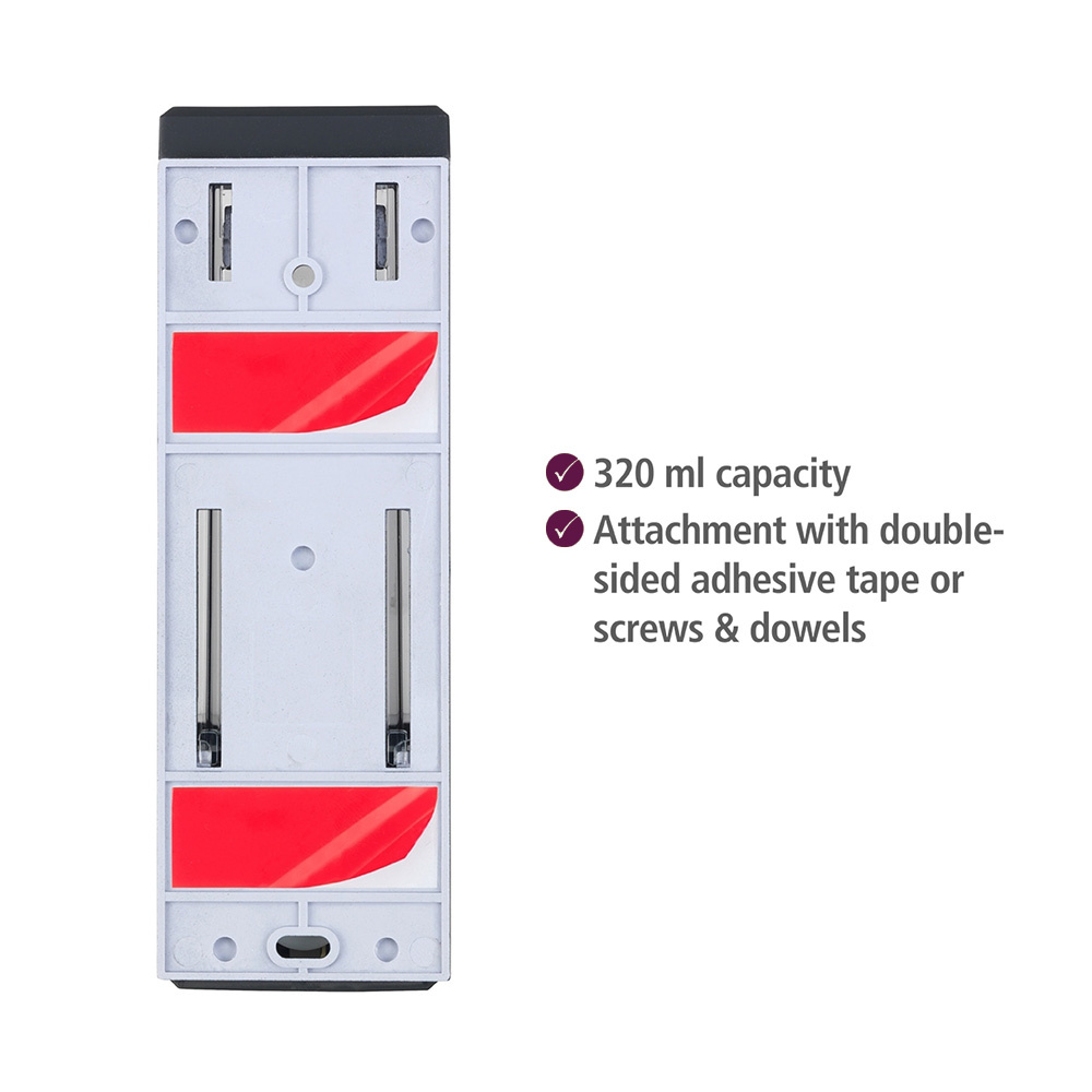 De zeepdispenser voor aan de wand is gemaakt van kunststof en kan op meerdere manieren worden gemonteerd. Er worden schroeven en pluggen meegeleverd waarmee je de wand zeepdispenser kan vastzetten. Maar de zeepdispenser kan ook met dubbelzijdig plakband worden gemonteerd als je niet wilt boren in de muur. De shampoo dispenser voor de douche is 6 cm breed, 7,5 cm diep en 18 cm hoog, gemaakt van kunststof en is verkrijgbaar in zwart. Er past in totaal 320 ml van je favoriete zeep in de houder.