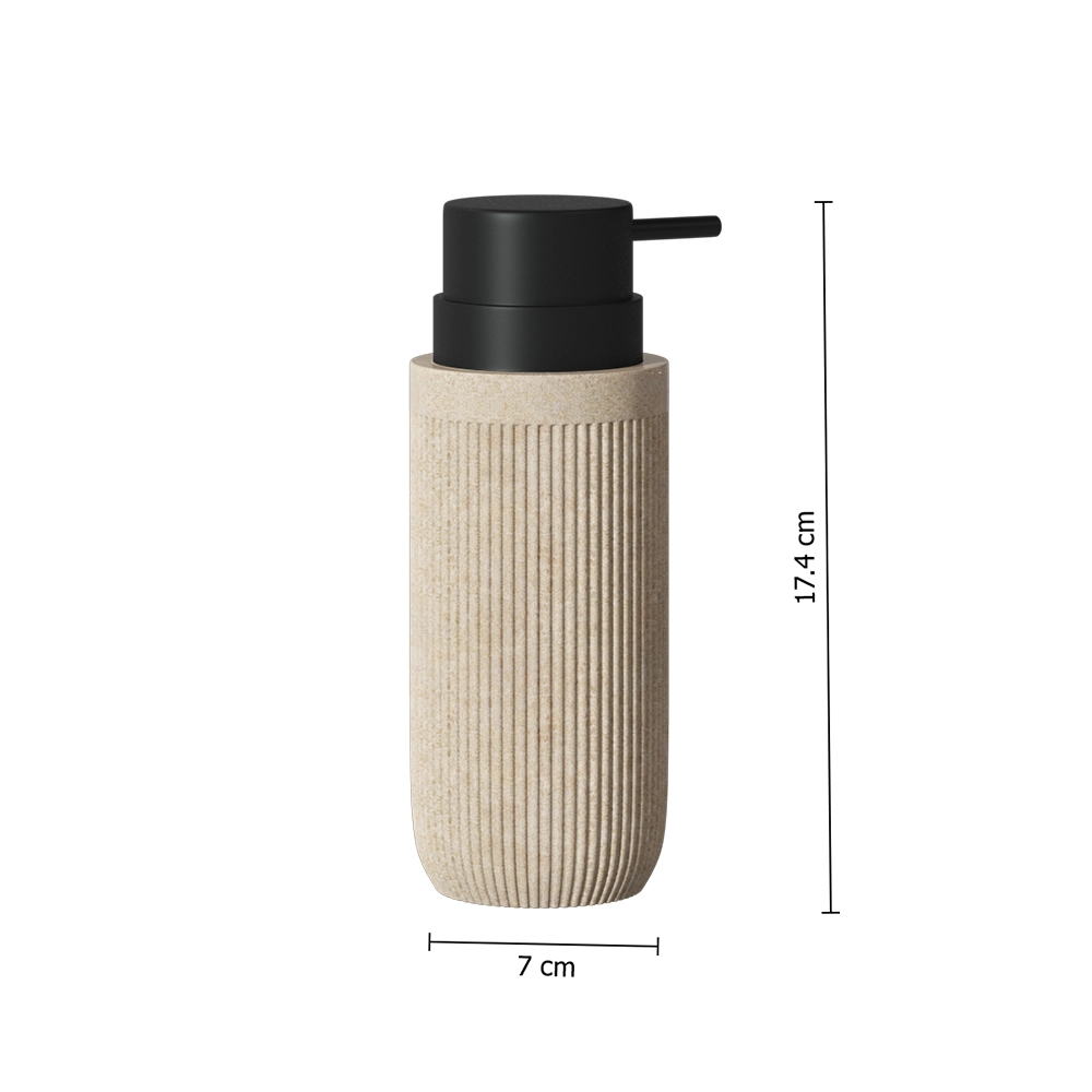 Dit zorgvuldig ontworpen zeeppompje is vervaardigd uit hoogwaardig polyresin, waardoor het een kwaliteitsvolle en stijlvolle keuze is voor elk interieur. De strakke zandkleur gecontrasteerd met de zwarte dispenser kop creëert een moderne en toch tijdloze look. Deze zeepdispenser is niet alleen een lust voor het oog, maar ook bijzonder praktisch in gebruik. Met een royale inhoud van 350 ml hoef je niet voortdurend te hervullen, terwijl het eenvoudige navulsysteem ervoor zorgt dat je dit met gemak doet wanneer nodig. Of het nu gaat om zeep, lotion of desinfecterende gel, dit zeeppompje doseert de perfecte hoeveelheid met slechts één druk. Het zeeppompje heeft een diameter van 7 cm en is 17.5 cm hoog.