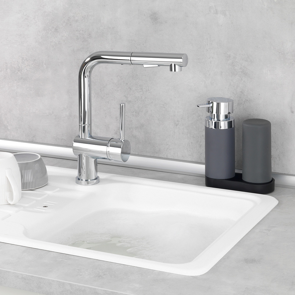 Met deze slimme combinatie van een zeeppomp met afwasmiddeldispenser heb je alles binnen handbereik staan bij de spoelbak. Door het slanke ontwerp maak je optimaal gebruik van de smalle ruimte achter je gootsteen.
