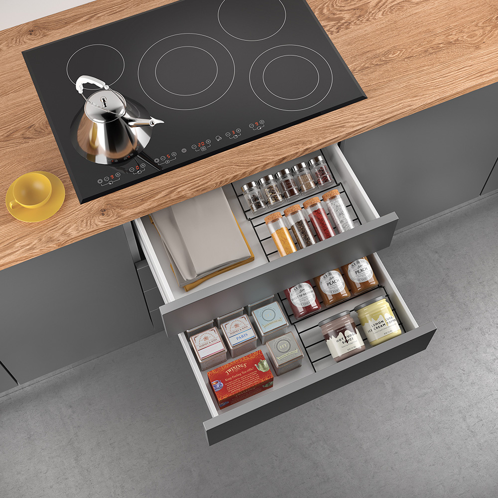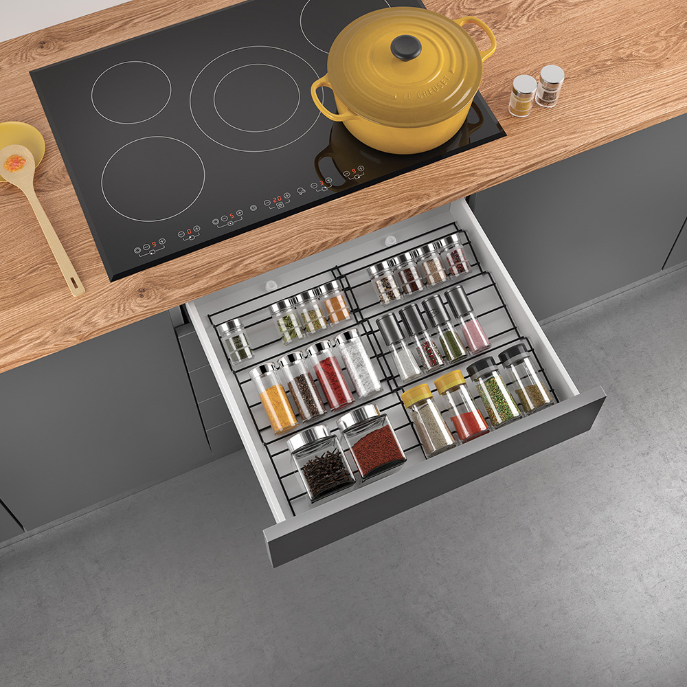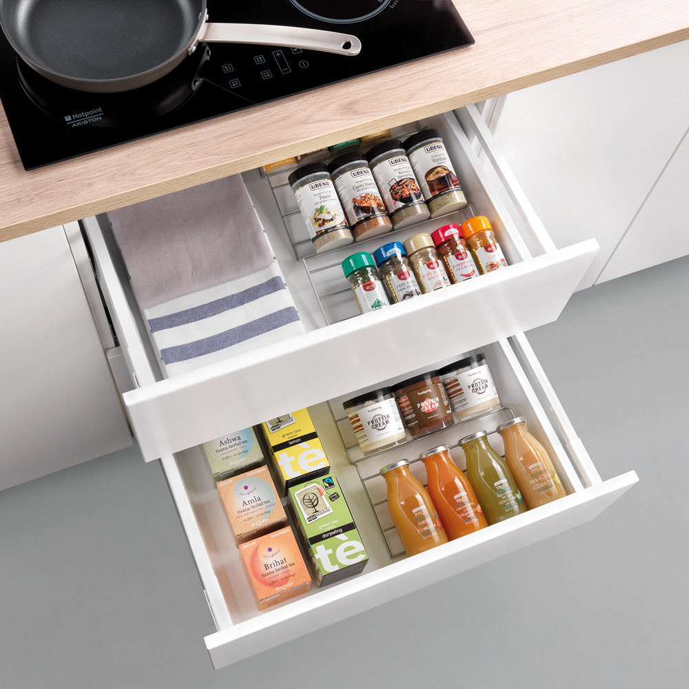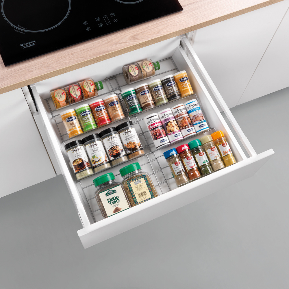Omdat het kruidenrek uitschuifbaar is, past het nagenoeg in alle keukenlades. Schuif het rek uit en sla allerlei soorten bakjes en doosjes op. Maar je kan het rek ook gebruiken als kruidenhouder in een lade om kruidenpotjes en sauzen op te bergen. Metaltex ontwikkelt continu nieuwe producten voor het dagelijks gebruik om het huishouden gemakkelijk te maken. Meer bijpassende metalen opbergproducten voor in de keuken vind je in de Smart Kitchen collectie van Tomado Metaltex.
