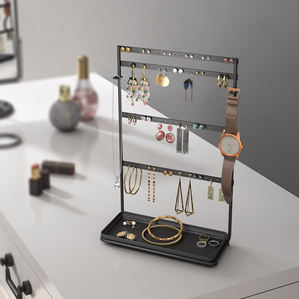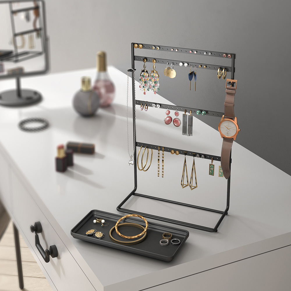 Dit zwarte oorbellenrekje is 26 cm breed, 11 cm diep en 36 cm hoog en heeft 5 jaar fabrieksgarantie. Het rek is gemaakt van metaal met een Touchterm Lava coating.