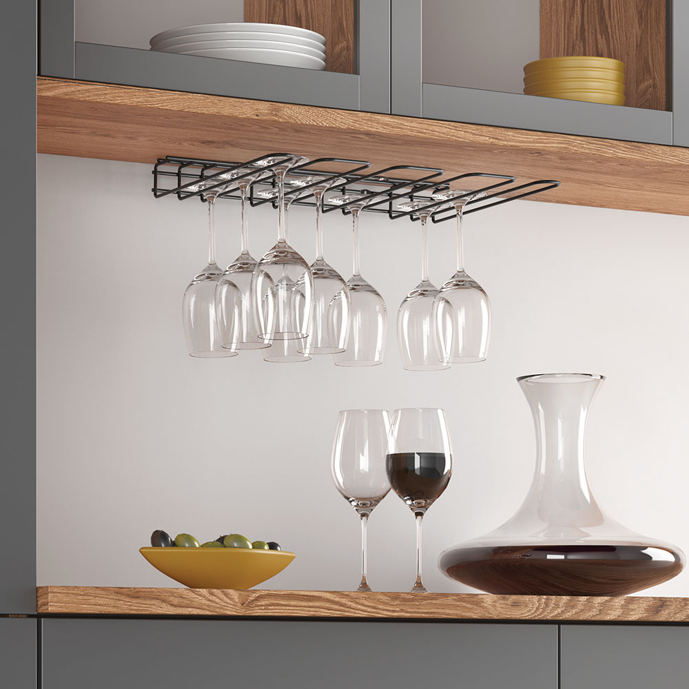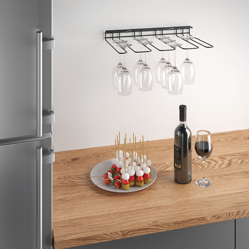 Praktisch wijnglazenrek hangend voor aan een keukenkastje of plank. Roestbestendig, schokbestendig en antistatisch. Plaats voor maximaal 16 wijnglazen.