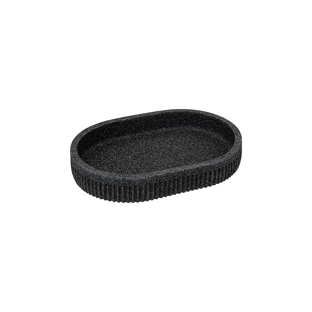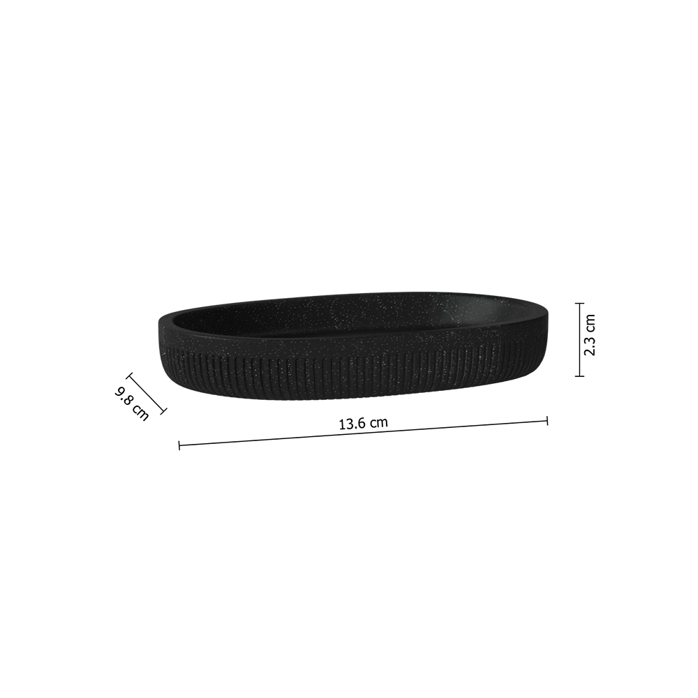 Dit zeepbakje is vervaardigd uit hoogwaardig polyresin, bekend om zijn stevigheid en duurzaamheid, en afgewerkt in een tijdloze zwarte kleur. De subtiele streepjespatroon aan de zijkant voegt een vleugje verfijning toe, waardoor het bakje meer is dan alleen een functioneel item; het is ook een stijlvolle toevoeging aan uw badkamerdecor. Met afmetingen van 13,6 cm breed, 10 cm diep en 2,5 cm hoog, is dit zwarte zeephouder compact genoeg om op elke wastafel of badrand te passen zonder veel ruimte in te nemen.