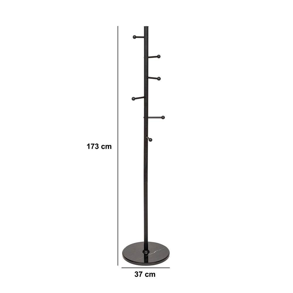 Dankzij het compacte ontwerp en de stevige constructie is deze kapstok ideaal voor dagelijks gebruik. Deze zwarte staande kapstok is 173 cm hoog en heeft een stabiele voet met een diameter van 37 cm, uitgevoerd in zwart marmerlook. De stevige metalen structuur is afgewerkt in stijlvol zwart en voorzien van 6 ophanghaken voor jassen, tassen, sjaals of hoeden. Dankzij het tijdloze design en de hoogwaardige materialen past deze kapstok staand perfect in moderne en chique interieurs. De kapstok is eenvoudig zelf te monteren.