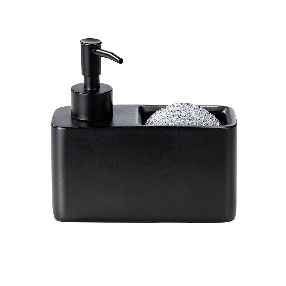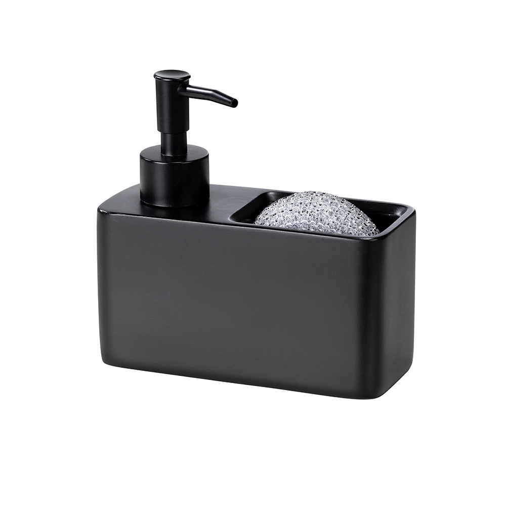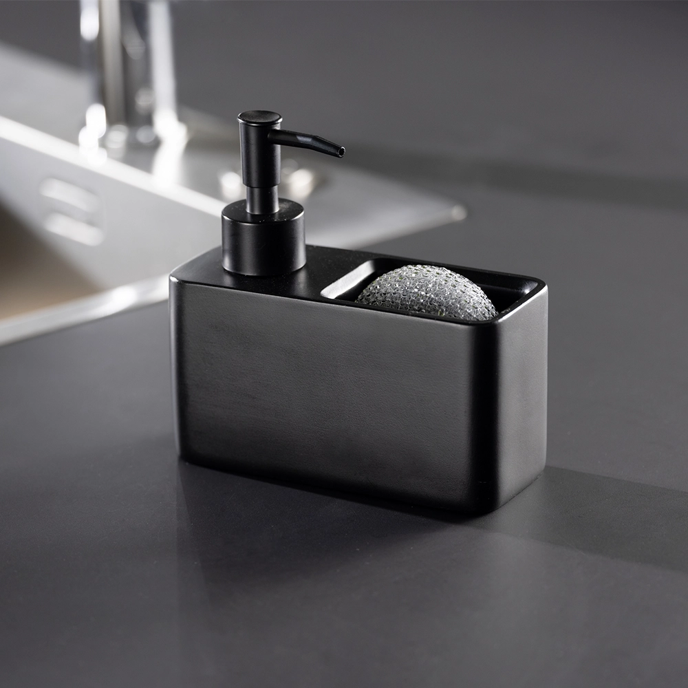 Zoek je een stijlvolle oplossing voor een zeeppomp met een houder voor je schuurspons? Onze zwarte zeepdispenser met sponshouder combineert elegantie met functionaliteit, ideaal voor het veilig en geordend bewaren van je zeep of afwasmiddel en spons.