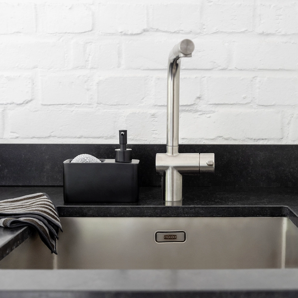 De zwarte zeepdispenser straalt een tijdloze elegantie uit en is functioneel in elke keuken. Het simplistische en elegante ontwerp maakt het een perfecte toevoeging aan elke interieurstijl, thuis of in de camper. Deze zeepdispenser biedt niet alleen ruimte voor afwasmiddel, maar de sponshouder houdt je spons hygiënisch op zijn plek, zodat je werkblad droog en schoon blijft.